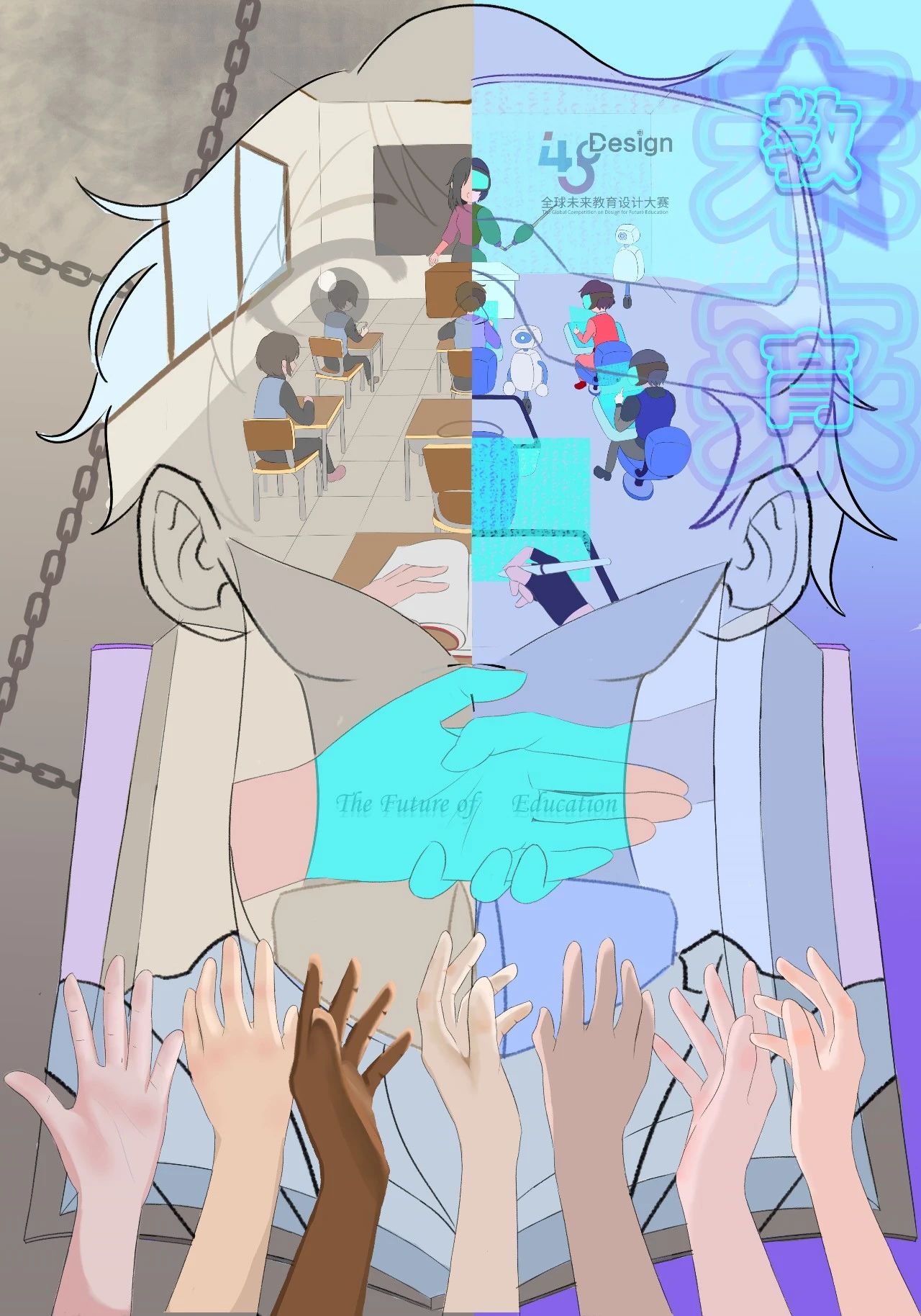 作品创思:海报融合抽象与写实,将教育场景融入人物轮廓之中,画面一分为二,过往与未来并置,直观展现随着科技进步,VR技术引领教育新风尚。未来师生佩戴VR眼镜,于虚拟空间中进行教与学。两种画面色彩对比鲜明,映照出对未来教育科技化的无限憧憬。人物轮廓与流畅线条交织,设计感油然而生,书本元素寓意教育本质。书本轮廓中间,未来之手穿越书本,紧握过往之手,通过VR技术连接时空,象征着人类对教育现代化、科技赋能未来的不懈追求与共同愿景。