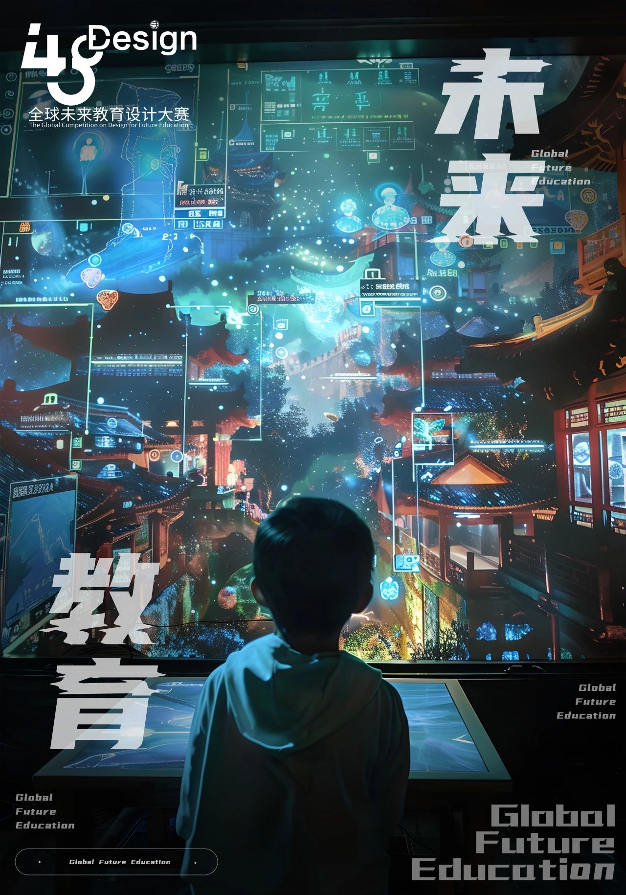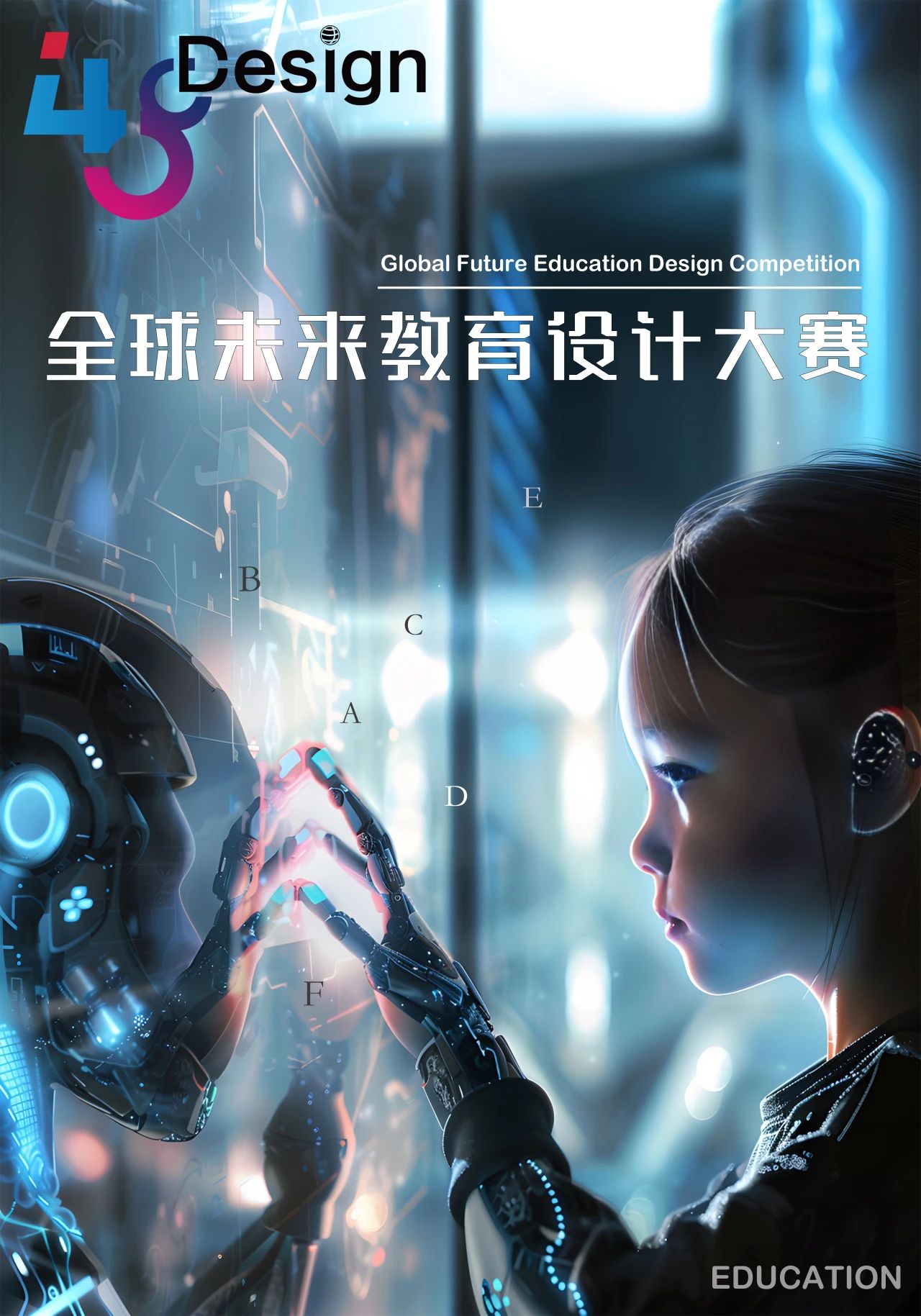 作品创思:海报设计灵感源自经典《E.T.外星人》电影封面,巧妙融合教育与科幻元素。画面右侧,未来教育中最主要的主体受众“学习者”跃然纸上。左侧AIGC生成式人工智能机器人并肩而立。二者指尖轻触,预示人机和谐共生,引领教育新风尚,展现未来教育在AI与大数据浪潮下的蓬勃生机与变革趋势。光芒自触碰点迸发,不仅映照教育辉煌未来,更象征着当下以生成式人工智能、大数据为发展引领趋势的时代下,未来教育更加多元一体化的学习模式与学习场景。
