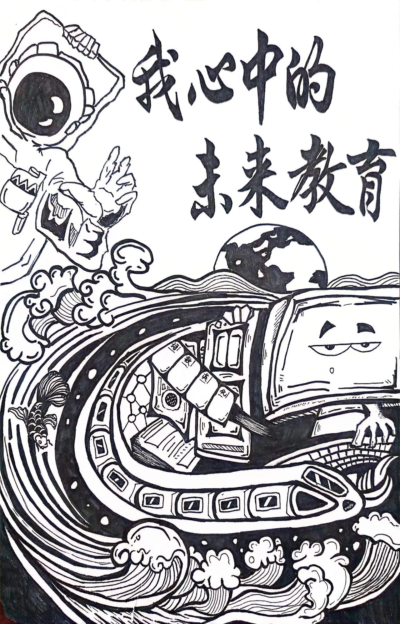 作品创思:海报由作者独立创作,以黑白之韵勾勒未来教育蓝图。简约中蕴含深意,展现了对教育创新与科技融合的深切期许,引领观众共赴未来教育的美好之旅。