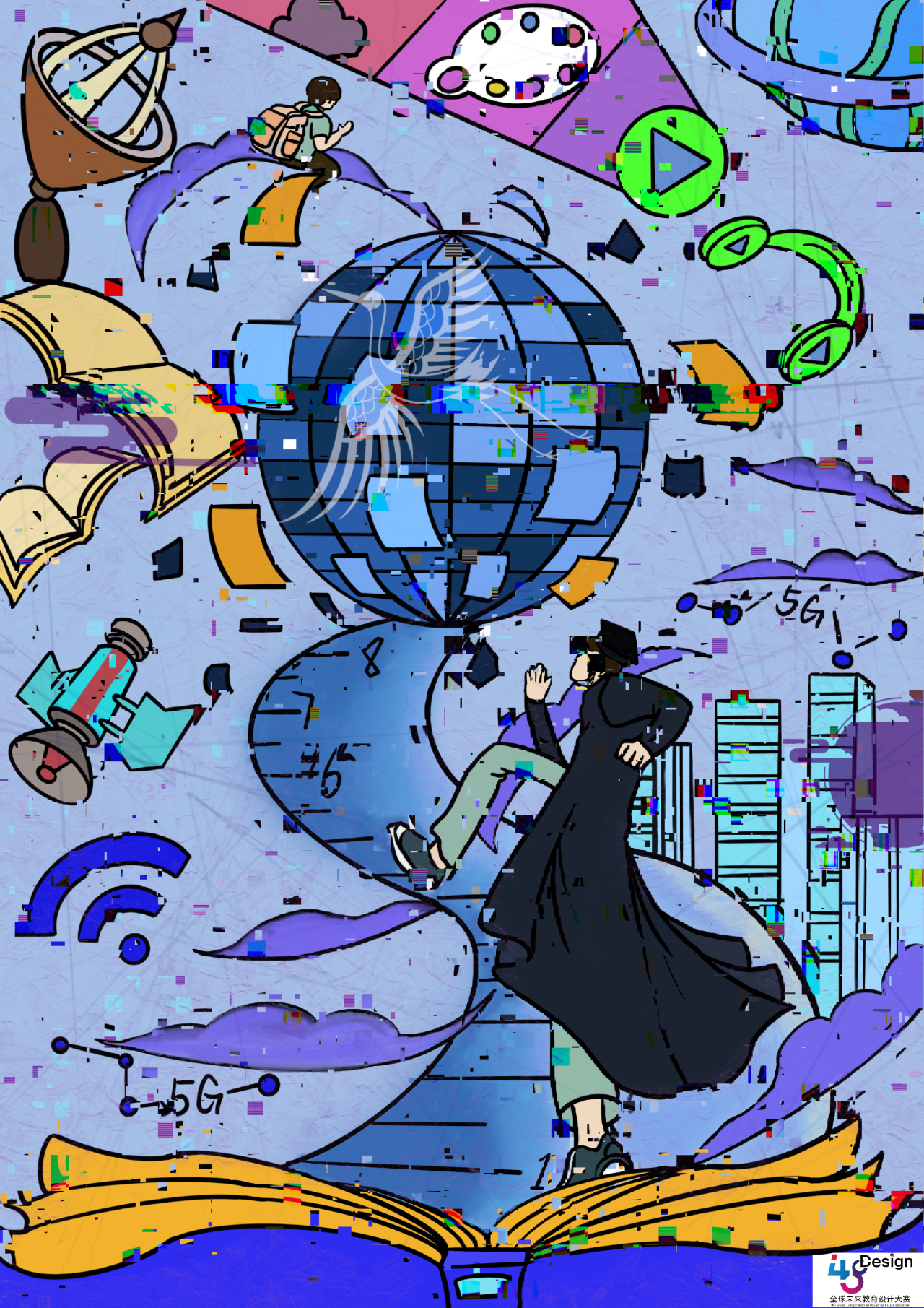 作品创思:作品围绕“人文关怀与创新融合”的核心理念,精心打造了一个旨在促进教育公平、消弭障碍的愿景世界。设计命名为《信息可视化》,灵感深植于个人学习之旅的点滴挑战,巧妙融合了创作者的真实体验与未来展望。该作基于VR元素,采用发散式构图,将佩戴VR的仰视少女作为核心主体,与弹琴小男孩等多元元素交织。画面中,知识被创意性地图形化,多种元素共同构建了一个教育交互的新图景,寓意科技力量正引领教育走向普惠与公平。色彩上,蓝黄对比鲜明,蓝色主调奠定科技基调,黄色点缀增添活力,共同营造出丰富的视觉体验。