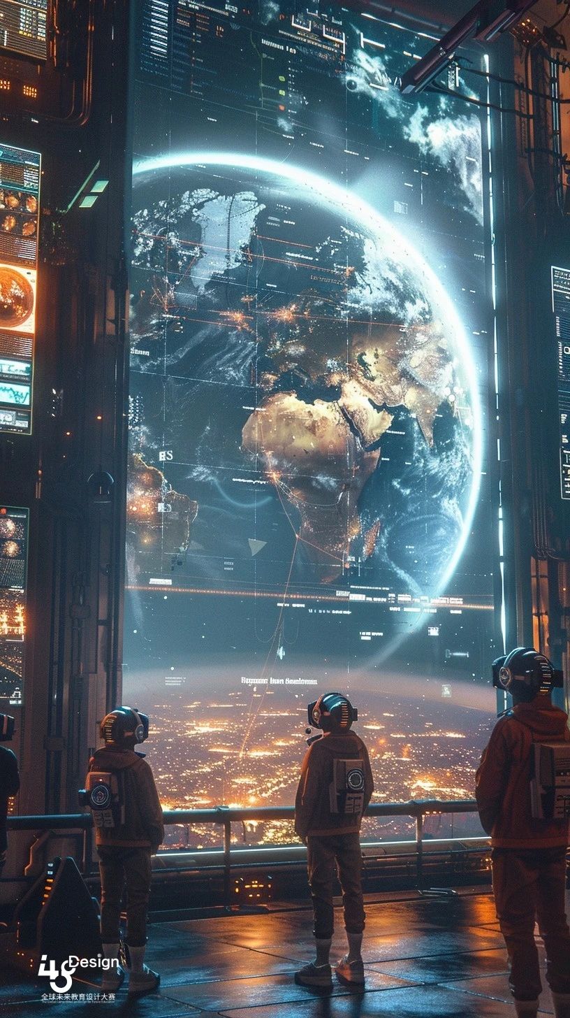 作品创思:海报描绘了未来学子居家学习的新常态,一位年轻学生坐在家中,四周环绕着的全息大屏,编织出未来教育的斑斓画卷。一面屏幕,带他穿梭至万里长城,触摸历史脉搏;另一面,则引领他遨游星际,揭秘宇宙奥秘。这些高科技屏幕不仅视觉震撼,更以触摸与手势互动,让学生沉浸式体验学习乐趣,点燃探索未知的熊熊火焰。