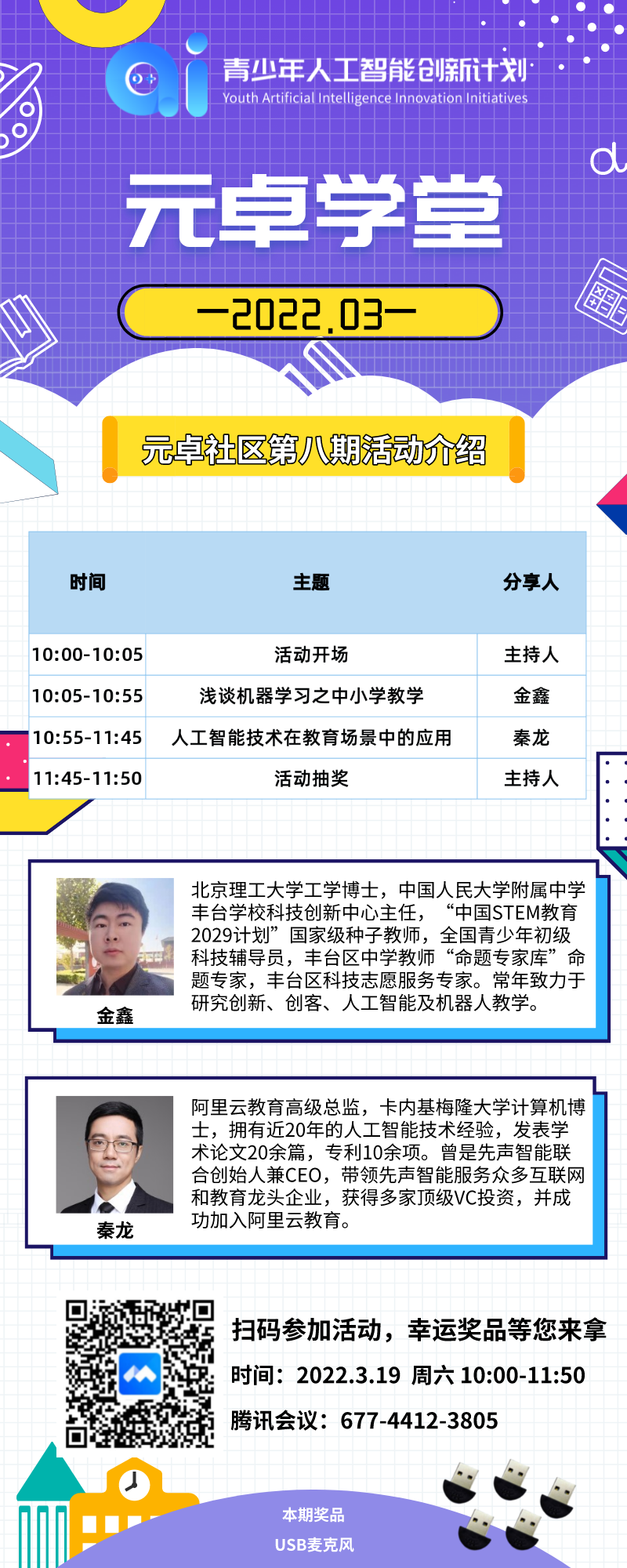 本周六(3月19日)第八期“元卓学堂”,将围绕中小学算法教学实践和人工智能技术应用展开。人大附中丰台学校科技创新中心主任金鑫分享的主题是“浅谈机器学习之中小学教学”,阿里云教育高级总监秦龙分享的主题是“人工智能技术在教育场景中的应用”,期待与各位老师再次相聚。
