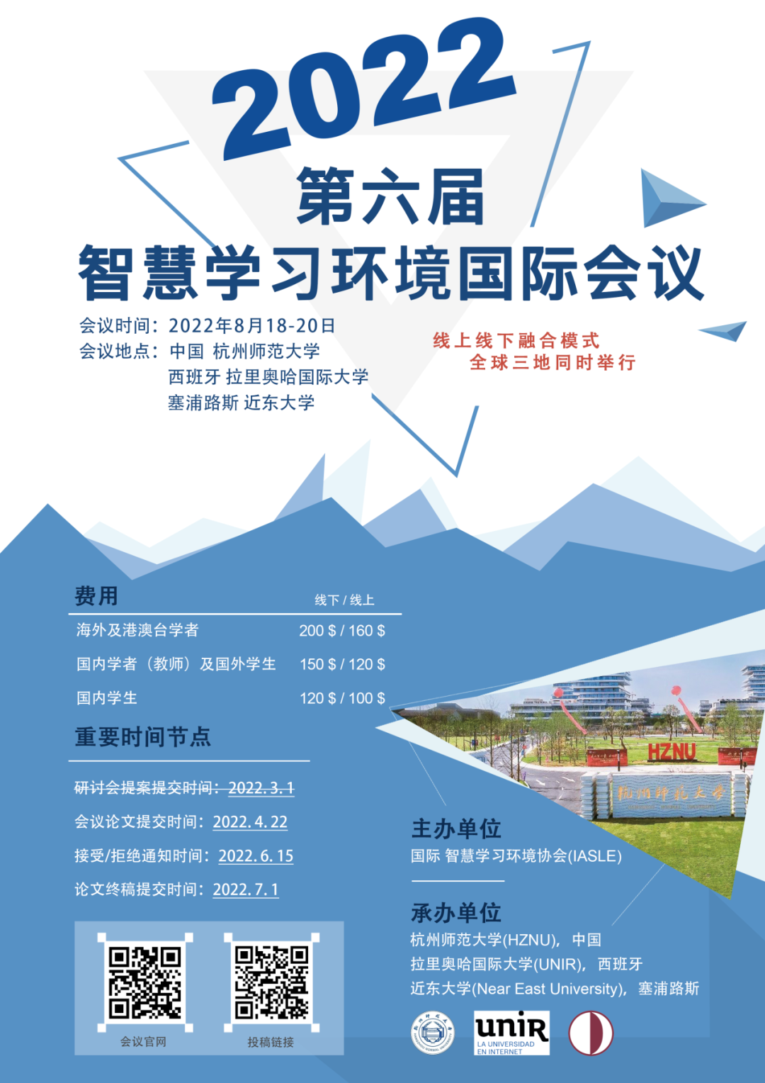 第六届智慧学习环境国际会议(2022 ICSLE)(http://iasle.net/icsle-2022/)将于2022年8月18日至20日以线上虚拟会场和线下参会相结合的方式,在中国杭州师范大学、西班牙拉里奥哈国际大学和塞浦路斯近东大学同时举办。线上参会者将享有注册费优惠,欢迎大家通过EasyChair踊跃投稿。为征集更多高质量的论文,邀稿期限延长至4月22日,已投稿的作者仍可在期限内修改论文。
