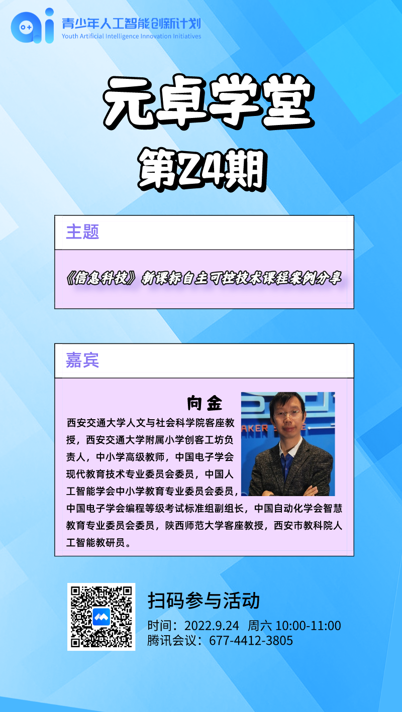 本周六(9月24日)元卓学堂邀请西安交通大学人文与社会科学院客座教授,西安交通大学附属小学创客工坊负责人向金老师为我们带来《<信息科技>新课标自主可控技术课程案例分享》专题讲座,欢迎各位老师参与活动,交流讨论。
