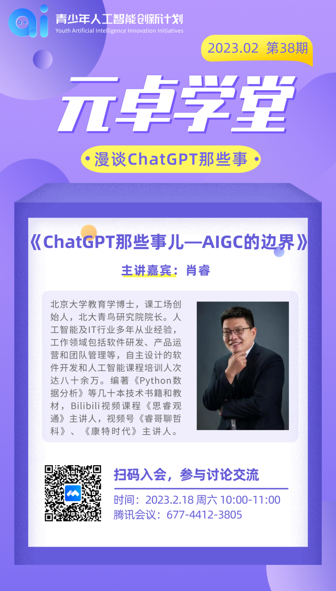 本周六(2月18日),北京师范大学元卓计划项目组邀请北大青鸟研究院院长肖睿博士,围绕“ChatGPT、AIGC(AI Generated Content)的边界”展开分享,欢迎各位老师参加活动。