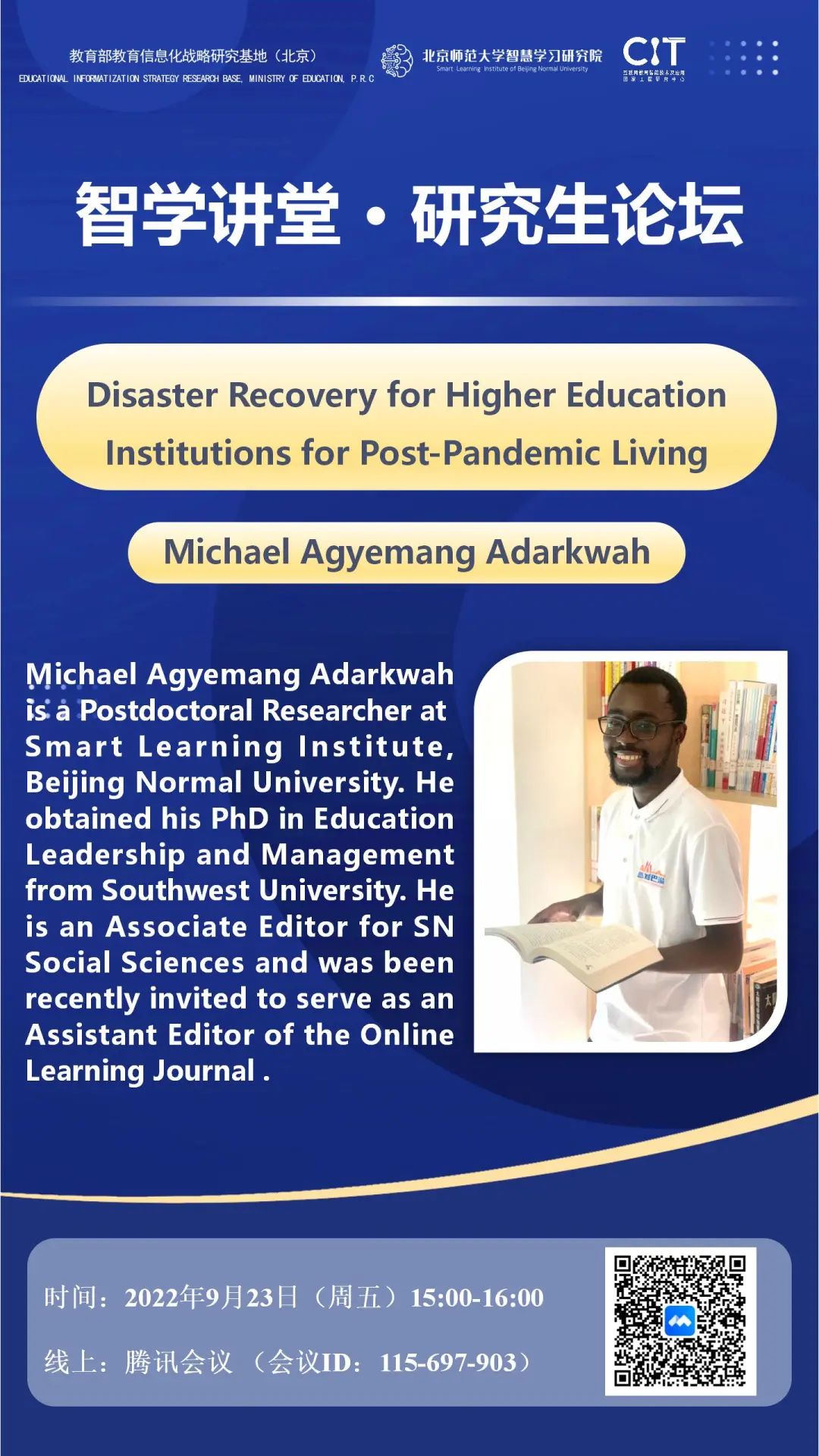 智学讲堂·研究生论坛将于9月23日(周五)举办,本期邀请Michael Agyemang Adarkwah进行分享,敬请各位同学和老师参加。