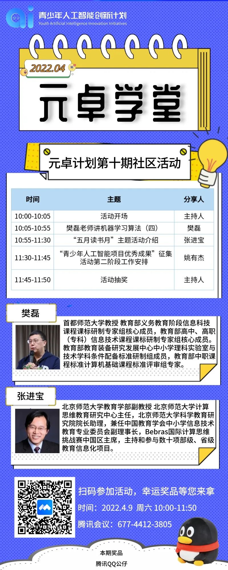 元卓计划持续开展“元卓学堂”系列活动(每周六 10:00-11:50 腾讯会议:677-4412-3805),旨在为人工智能感兴趣的老师提供一个互相交流和学习的平台。