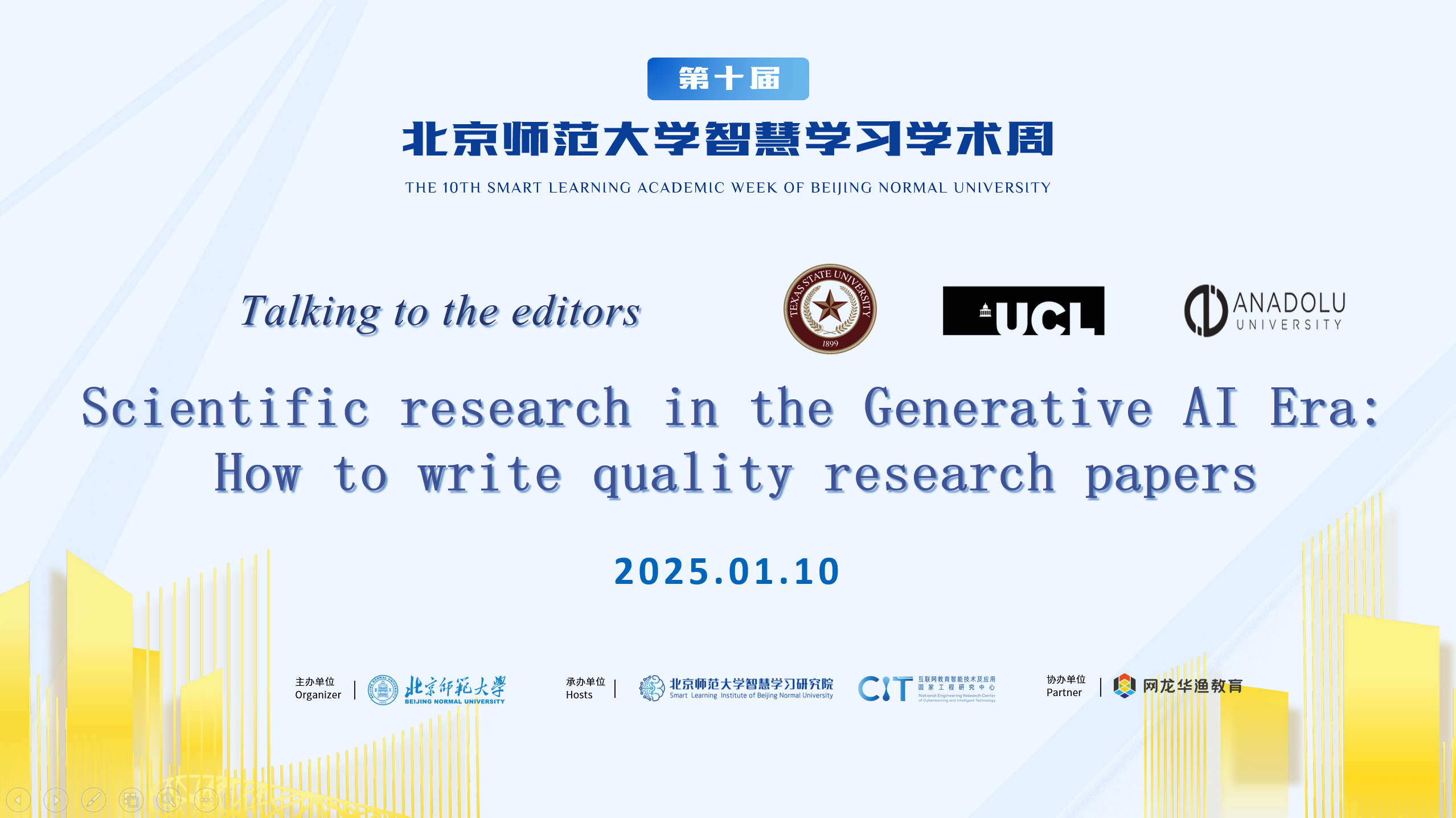 2025年1月10日下午,北京师范大学第十届智慧学习学术周“生成式人工智能时代的科学研究——如何撰写高质量研究论文研讨会”成功举办。此次研讨会由北京师范大学智慧学习研究院主办,邀请了来自国际期刊的主编分享生成式人工智能对科学研究论文的撰写、评审、发表等环节带来的影响。本次研讨会由北京师范大学副研究员、Smart Learning Environments期刊副主编Ahmed Tlili博士主持,采用在线方式展开讨论。研讨会还邀请了来自土耳其阿纳多卢大学Open Praxis和Asian Journal of Distance Education期刊主编Aras Bozkurt博士,美国德克萨斯州立大学Leadership and Policy in Schools期刊主编Khalid Arar博士,和英国伦敦大学学院Review of Education期刊联合主编Melissa Bond博士参加,受到国内外高校师生的关注。