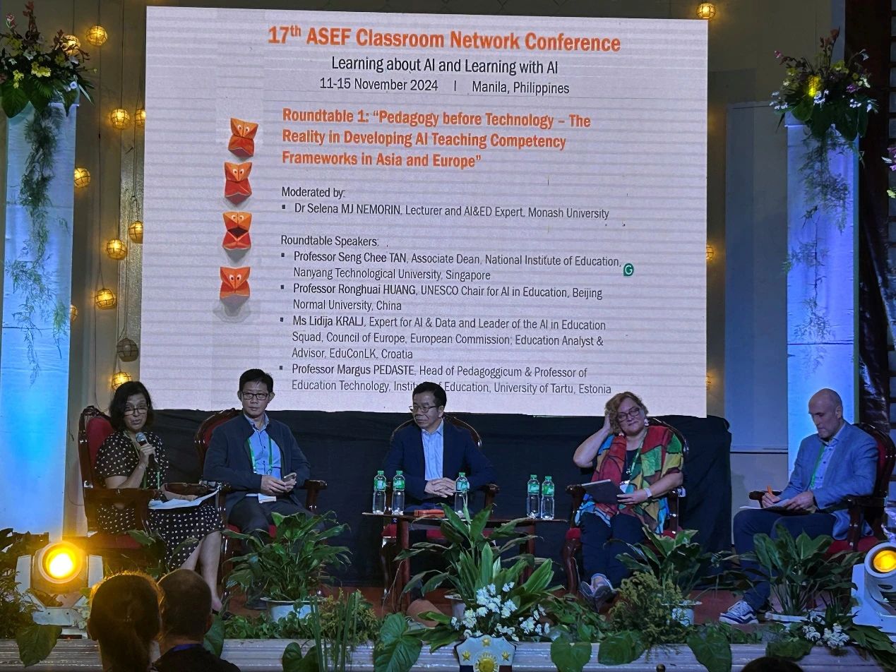 黄荣怀教授作为圆桌论坛嘉宾,参与了主题为“先教学法,再技术——亚洲与欧洲开发AI教学能力框架的现况”的研讨会。论坛讨论了教学法优先于AI技术的重要性,强调技术应作为辅助工具,而非教育的唯一驱动力。专家们探讨了如何确保技术不取代教学法的核心地位,并分析了当前关于教学和AI框架的讨论趋势对教师的影响。展望未来,与会嘉宾还讨论了如何进一步支持教师在AI技术融入教育中的需求与方向。