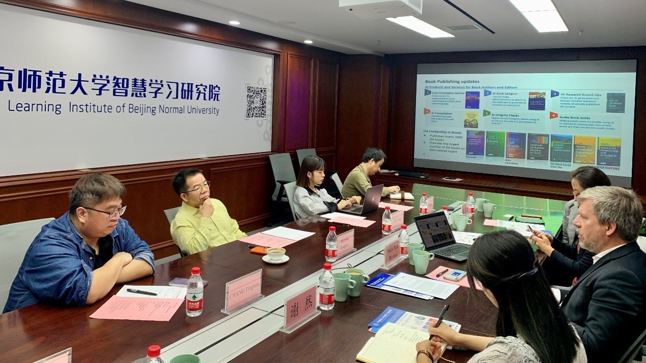 4月29日,Springer Nature全球图书总裁Niels Peter Thomas(汤恩平博士)、人文社会科学编辑总监及中国区图书总监李琰、东亚地区教育学图书编辑谢然、高级授权经理崔丽丽和客户经理冉璐一行来访北京师范大学智慧学习研究院,与北京师范大学智慧学习研究院院长黄荣怀、院长助理张定文、教育机器人工程中心主任姚有杰、助理研究员王欢欢和博士后达婷进行会谈。