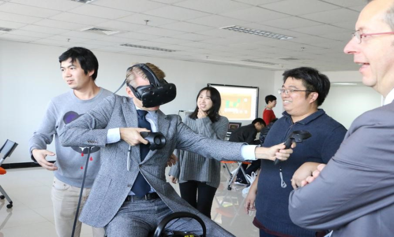 然后,在张定文主任的带领下,专家们分别参观体验了3D打印实验室、VR互动体验区、101智慧教室、99家居虚拟现实体验区等,研究院丰富而炫酷的3D、VR设备和资源吸引了体验者极大的兴趣,Gert Neelen在VR环境下体验骑马机之后,兴奋的说:“感觉自己真的是一名驰骋疆场的战士,非常酷!”