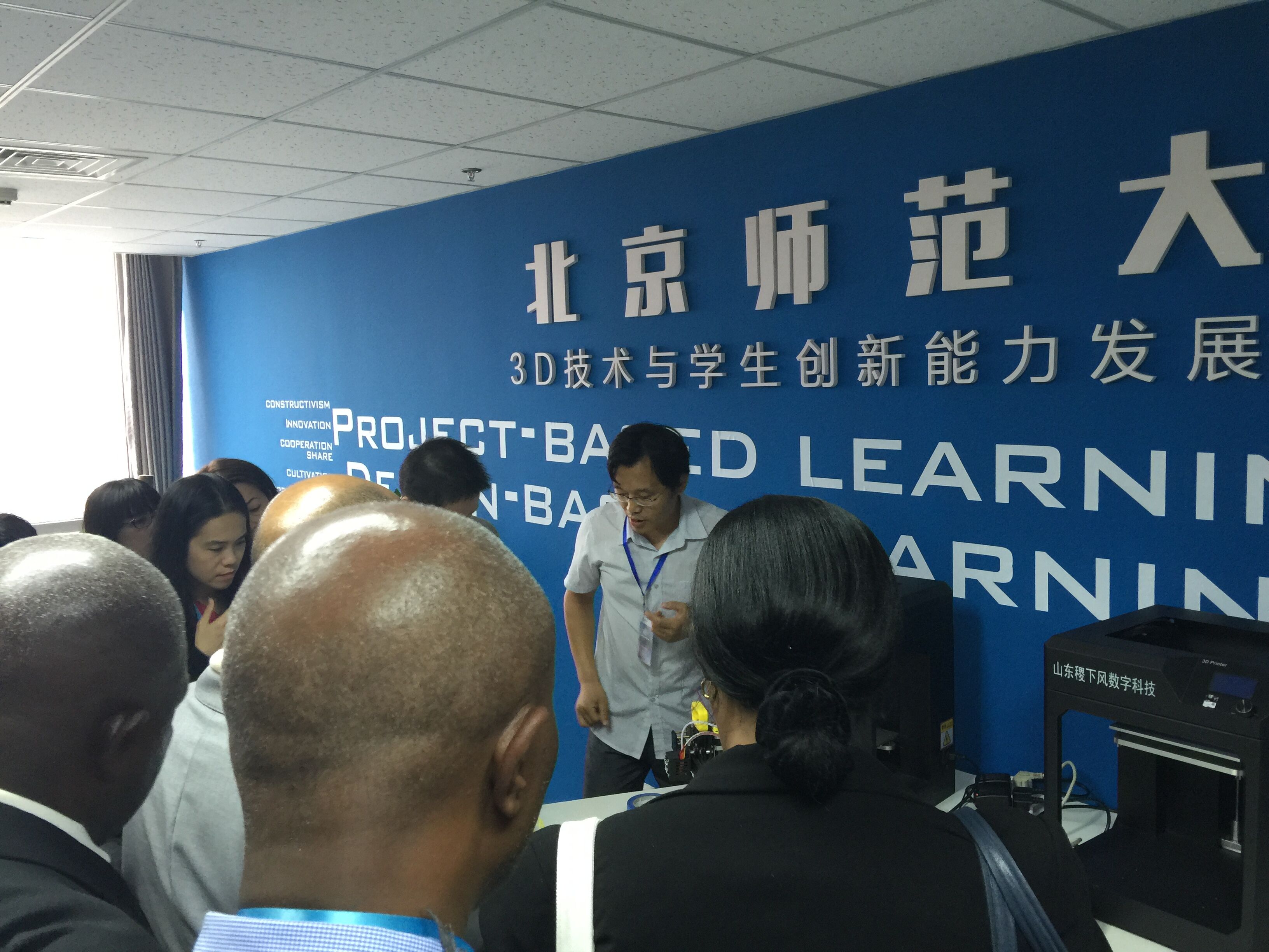 2015年9月1日下午,联合国教科文组织的官员和亚非14国代表共60余名外宾参观了智慧学习研究院。张志祯副院长代表研究院欢迎外宾的到来,国际部张定文主任、高媛博士先后为外宾详细介绍了研究院的组织架构、在研项目、核心产品、团队概况等,并带领外宾参观。张进宝副教授向外宾展示了3D技术与学生创新能力发展研究中心的主要研究和核心产品,引起了外宾的极大兴趣。在电子书实验室参观过程中,田涛老师为外宾展示了实验室设计开发的电子书,其设计理念和互动性吸引了众多外宾亲自体验。外宾普遍表示希望明年可以再次到访研究院,进一步体验101智慧教室等产品的魅力。