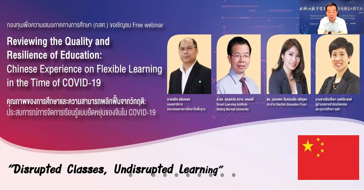 2021年7 月23日, 由泰国公平教育基金会(EEF)举办的公平教育基金国际论坛以网络研讨会的形式成功举办。论坛主题为关于教育质量和韧性的再思考:中国在疫情期间关于弹性教学的经验。黄院长出席论坛并发表演讲,分享了中国在弹性教学上的经验。
