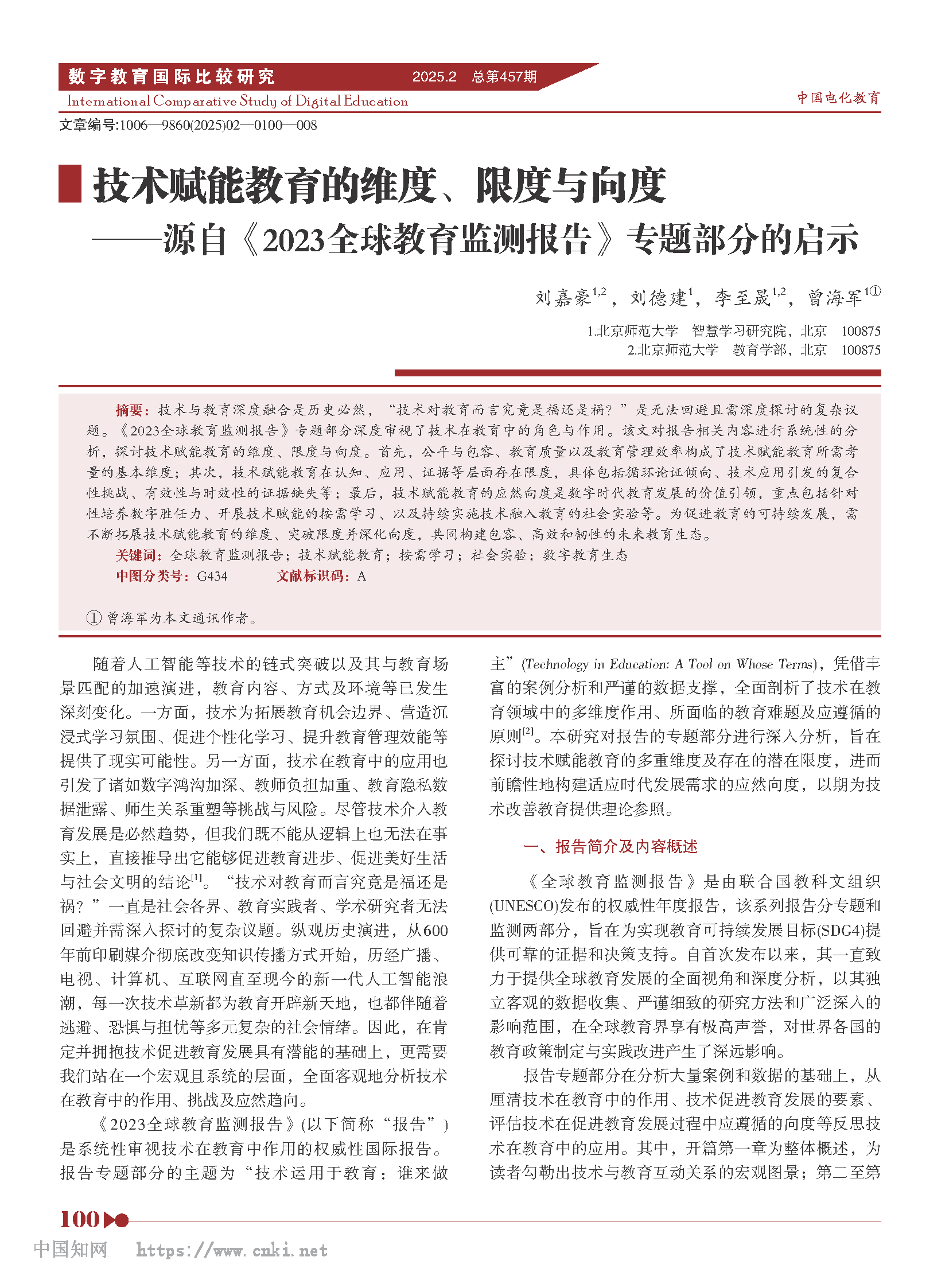 《2023全球教育监测报告》(以下简称“报告”)是系统性审视技术在教育中作用的权威性国际报告。报告专题部分的主题为“技术运用于教育:谁来做主”(Technology in Education:A Tool on Whose Terms),凭借丰富的案例分析和严谨的数据支撑,全面剖析了技术在教育领域中的多维度作用、所面临的教育难题及应遵循的原则[2]。本研究对报告的专题部分进行深入分析,旨在探讨技术赋能教育的多重维度及存在的潜在限度,进而前瞻性地构建适应时代发展需求的应然向度,以期为技术改善教育提供理论参照。