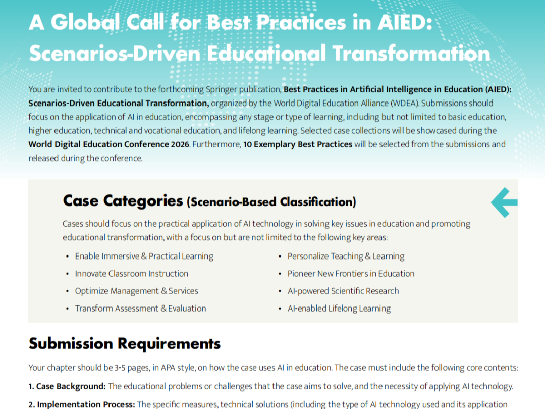 世界数字教育联盟现面向全球遴选具有代表性、示范性与推广价值的数字教育创新实践,发起“世界数字教育创新案例征集活动”。本次征集以“人工智能+教育:场景驱动的教育变革”为主题。案例征集截止时间为2026年3月31日。