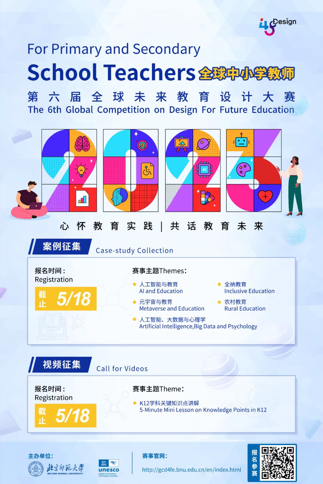 第六届全球未来教育设计大赛由北京师范大学与联合国教科文组织教育信息技术研究所联合主办,国内外组织机构、高校与知名科技企业为大赛提供支持。大赛专设中小学教师赛道,包含优秀教学案例设计和“5分钟学科知识点讲解短视频”征集两项活动,集中展示不同国家的中小学教师如何思考未来教育并付诸实践的实例,为全球未来教育发展寻找优质的解决方案。