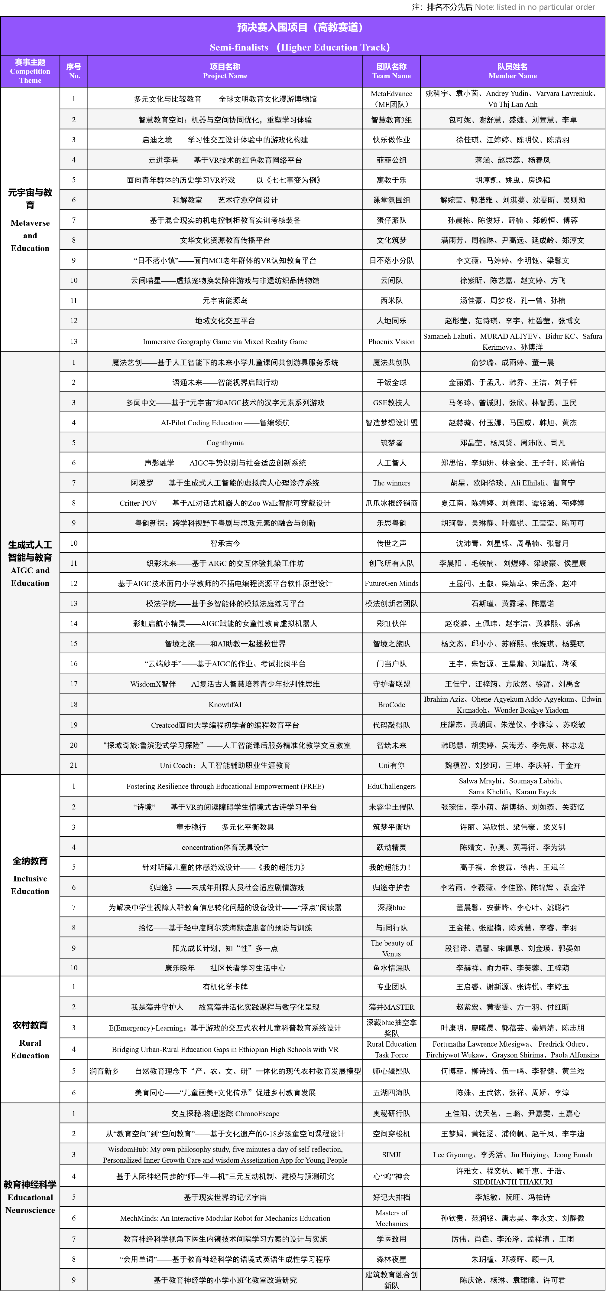 初赛阶段,高教赛道汇聚了来自全球200多所国内外高校的千余名学生的杰出创意,共收到160余份团队设计作品。今年参赛作品在选题和解决方案上均有了更多创新,不仅关注教育模式的革新,还充分融入AIGC等新技术,探索如何利用新技术解决各类教育问题,展现出青年参赛者对于未来教育与技术、设计融合的独到见解,对于教育事业发展的热忱和责任感。经过专家评审团的评选,共有59个项目作品成功晋级至预决赛阶段。