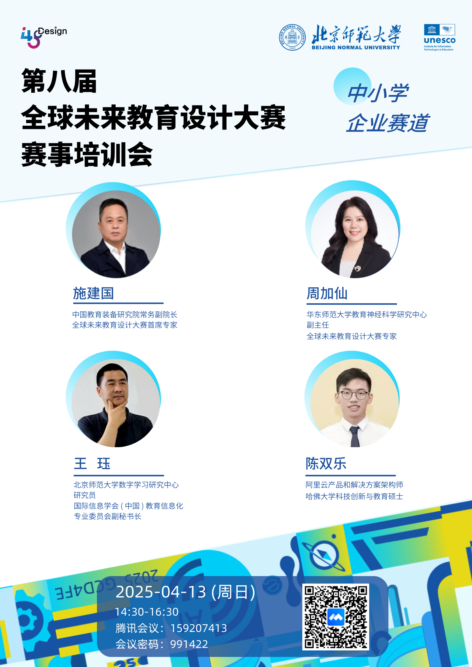 第八届全球未来教育设计大赛由北京师范大学和联合国教科文组织教育信息技术研究所联合主办。大赛设置中小学赛道和企业赛道,分别面向全球基础教育工作者、教育行业从业者,广泛征集富有创意的优秀案例。参赛者可围绕教育教学中的重难点问题,运用设计思维,结合人工智能等新兴技术,设计切实有效的创新解决方案,促进学生核心素养、实践能力与创新思维的全面发展。