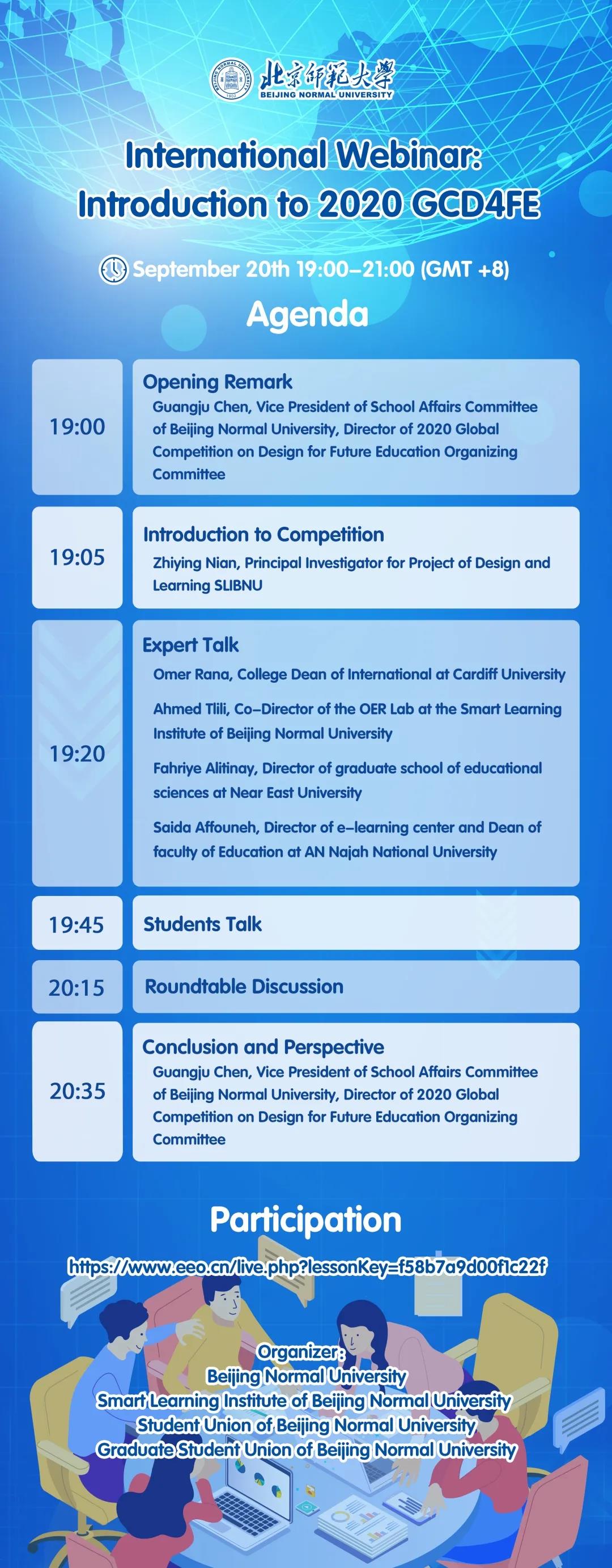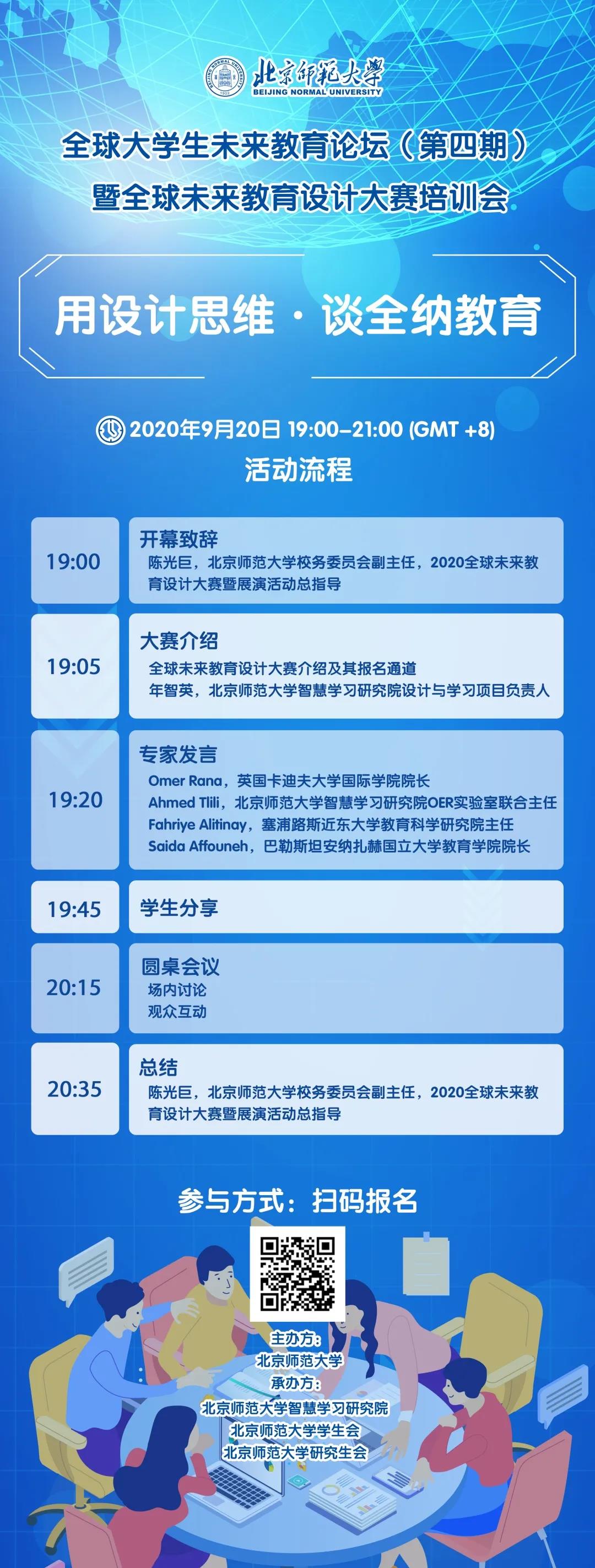 第四期“全球大学生未来教育论坛”将于9月20日举办。本次论坛持续聚焦全纳教育下的四个主题:危机下的教育、个性化教育、农村教育、特殊教育,请到英国卡迪夫大学国际学院院长,性能工程专业教授Omer Rana,北京师范大学智慧学习研究院OER实验室联合主任, UNIR iTED研究所访问教授,阿拉伯教科文组织专家Ahmed Tlili,塞浦路斯近东大学教育科学研究院主任,社会发展与研究中心联席主席Fahriye Alitinay,巴勒斯坦安纳扎赫国立大学教育学院院长,智慧学习中心主任Saida Affouneh发表主题演讲,并邀请来自不同国家的往年参赛选手与同学们进行分享,与观众进行互动。