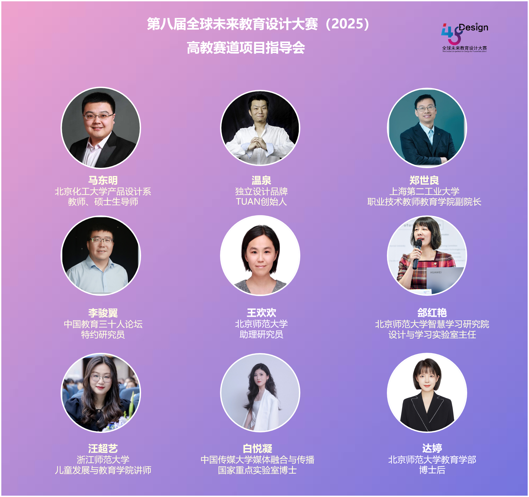 北京化工大学产品设计系教师、硕士生导师马东明,独立设计品牌TUAN创始人温泉,上海第二工业大学职业技术教师教育学院副院长郑世良,中国教育三十人论坛特约研究员李骏翼,北京师范大学助理研究员王欢欢,北京师范大学智慧学习研究院设计与学习实验室主任郐红艳,浙江师范大学儿童发展与教育学院讲师汪超艺,中国传媒大学媒体融合与传播国家重点实验室博士白悦凝,北京师范大学教育学部博士后达婷等专家齐聚线上,针对参赛汇报团队项目的问题界定,内容的创新性及可行性、用户需求匹配度、技术落地路径等核心问题提出专业建议,帮助参赛者优化方案逻辑,明确改进方向。