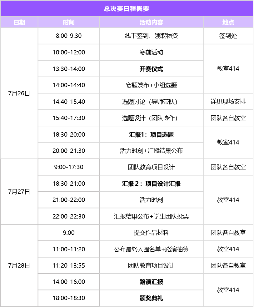 总决赛以线上线下结合的方式开展。参赛团队将在三天内完成从选题构思到最终展示的全过程。赛事首日,将进行签到、赛前活动、开赛仪式、赛题发布、小组选题讨论与初步设计,并于当晚进行项目选题汇报。7月27日,各团队进行项目设计,晚间将开展第二轮项目设计汇报,公布汇报结果并进行团队投票。7月28日,将公布最终晋级团队,进行路演汇报,角逐金、银、铜奖等多个奖项,并举行颁奖典礼。