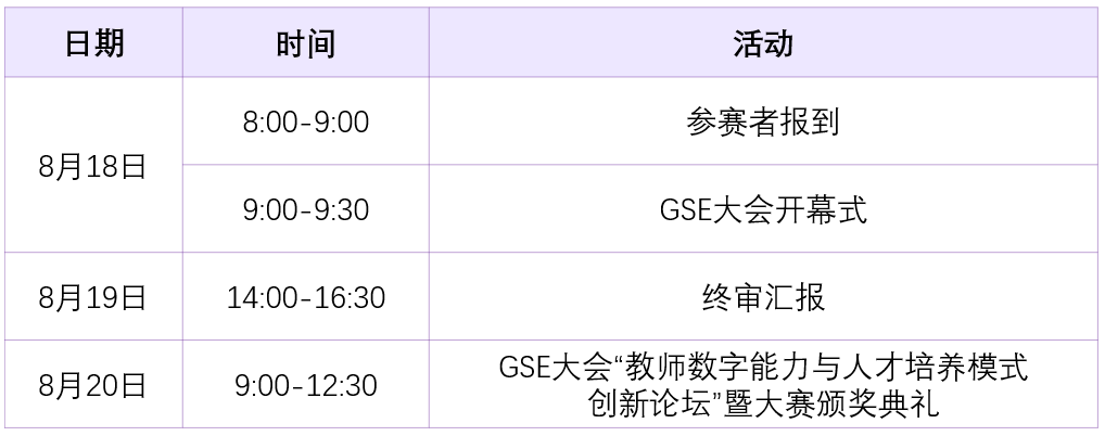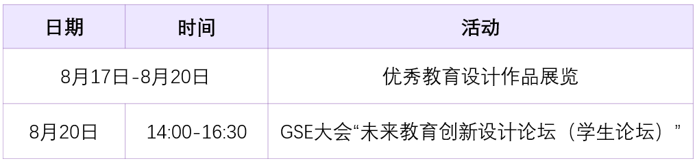 本次大赛总决赛活动将与2023全球智慧教育大会(Global Smart Education Conference, GSE)同期进行。总决赛期间,还将进行优秀教育设计作品展览及学生论坛等活动。精彩纷呈,敬请期待。