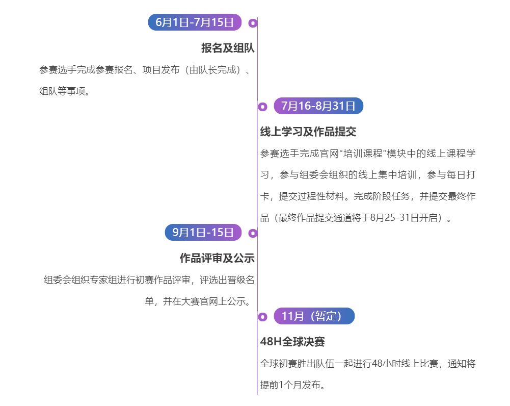 线上报名,线上组队合作,线上获取指导,线上提交最终作品;