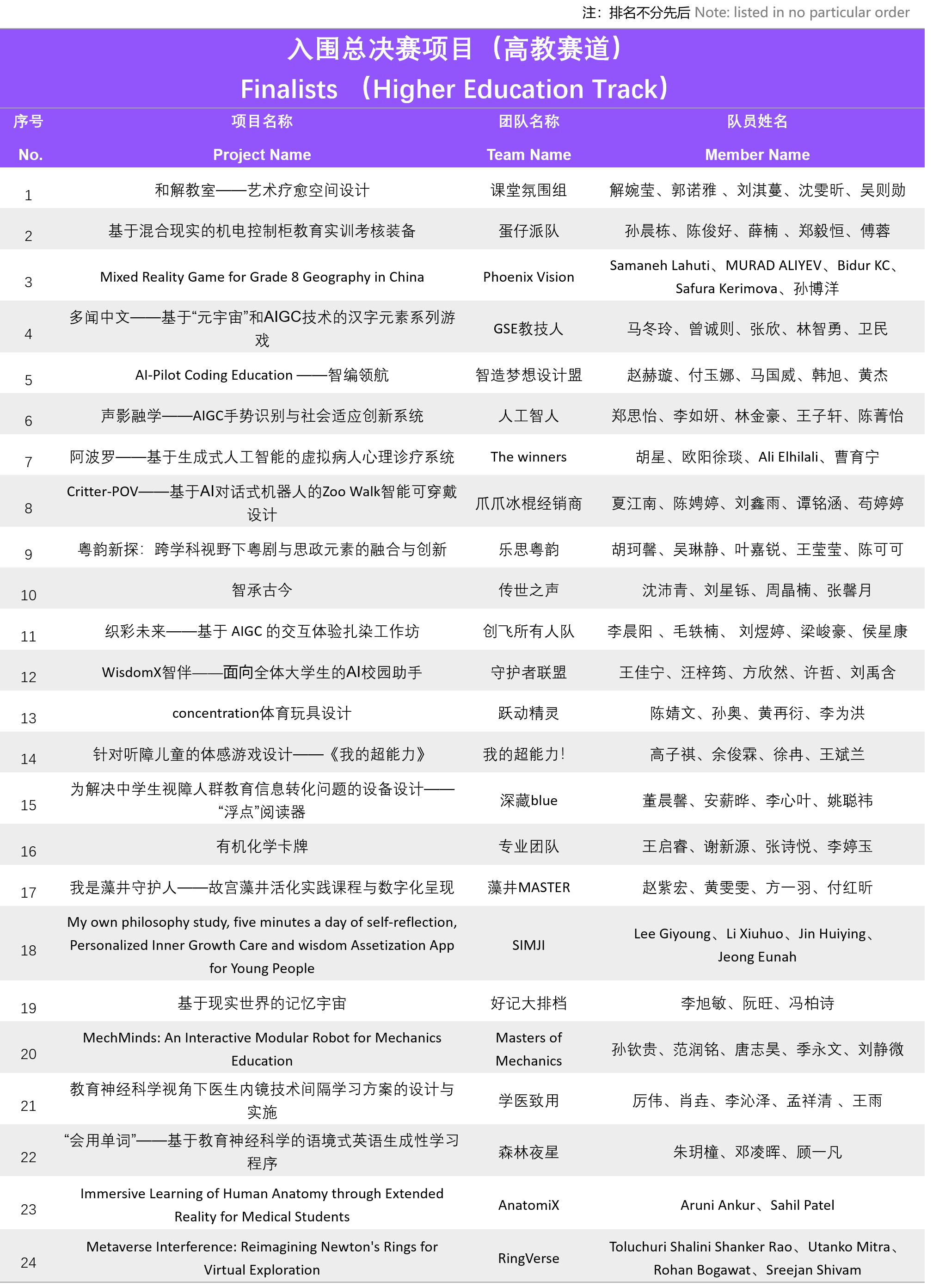 高教赛道总决赛,将于7月25日至28日在北京师范大学(昌平校园)线下举行。总决赛将重新命题,并有导师团队全程指导,各团队需要在48小时内完成全新的未来教育项目设计,请做好准备。 现公布高教赛道总决赛入围名单,详细如下: