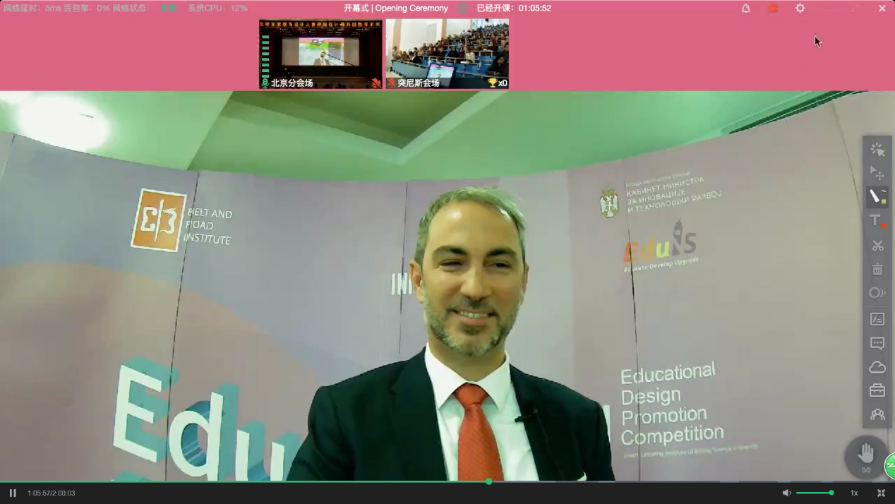 突尼斯凯鲁安大学副校长Taha Querfel以及塞尔维亚技术发展和创新部部长顾问Ugljesa Marjanovic教授也分别通过远程连线在开幕式上致辞,他们都高度赞扬了本次比赛,并表示非常高兴能与北京师范大学一起合力开展全球未来教育设计大赛,未来希望能有更多的合作机会。