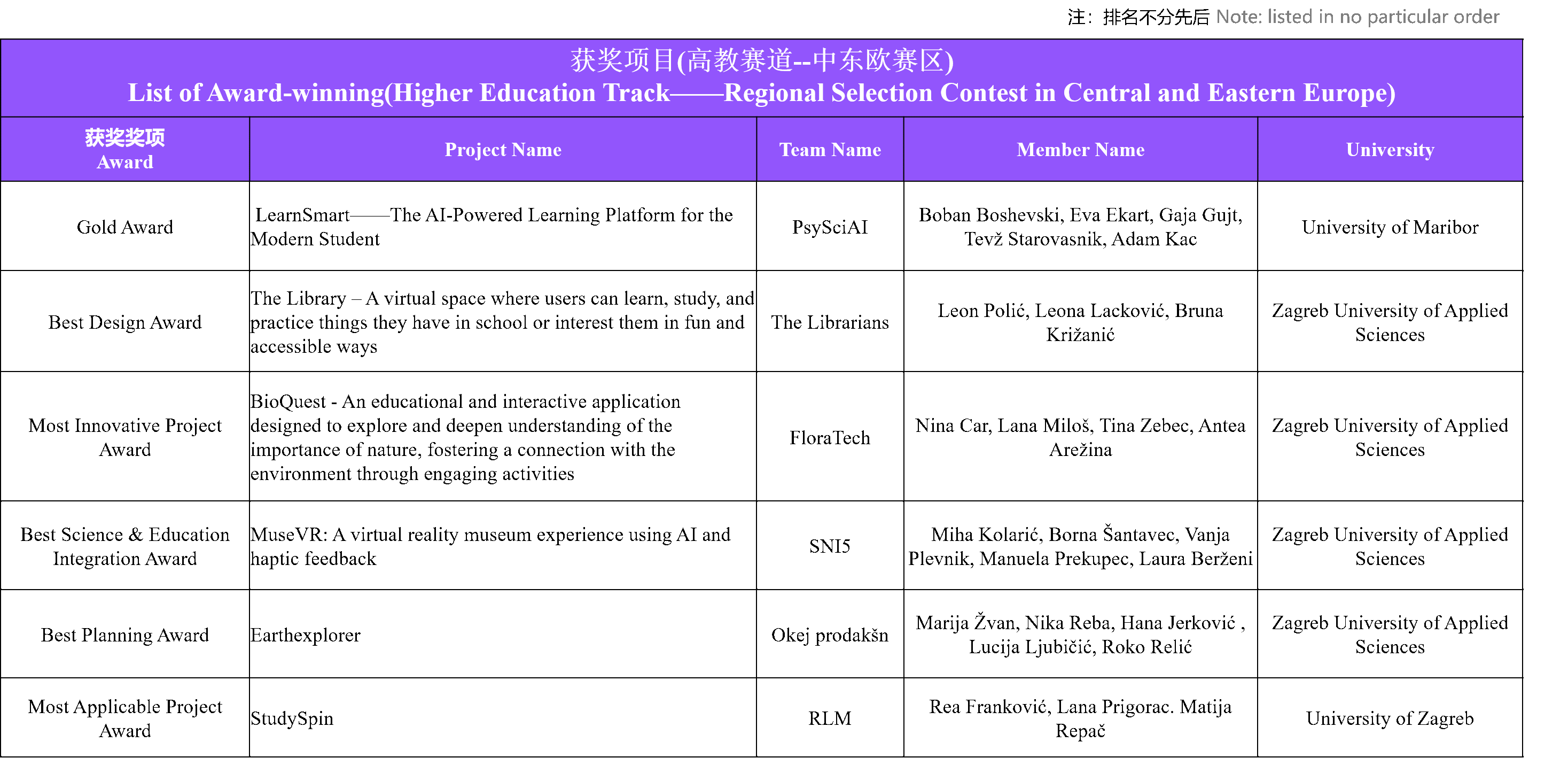 经过激烈角逐,大赛最终评选出中东欧分赛区预决赛Gold Award(金奖)一名,及Best Design Award(最佳设计奖)、Best Science & Education Integration Award(最佳科教融合奖)、Most Applicable Project Award(最佳应用奖)、Best Planning Award(最佳规划奖)、Most Innovative Project Award(最具创意奖)等各类奖项。