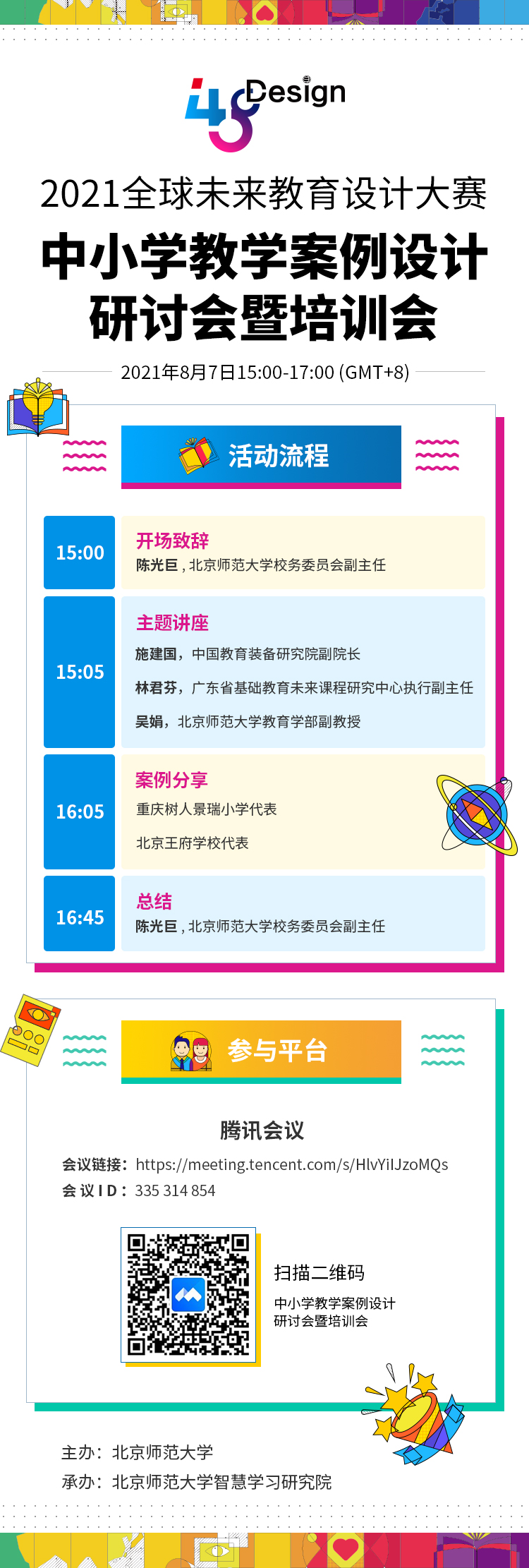 为了帮助中小学教师更好地理解大赛的相关要求,北京师范大学智慧学习研究院将于北京时间2021年8月7日15:00-17:00 通过腾讯会议举办“中小学教学案例设计研讨会暨培训会”。会议将邀请领域专家发表主题演讲,对案例设计和制作进行指导。重庆树人景瑞学校和北京王府学校已入选联合国教科文组织“移动学习最佳实践”案例,两校代表将在案例分享环节介绍相关经验,有助于中小学教师更好地完成案例设计,产出更多优秀案例。